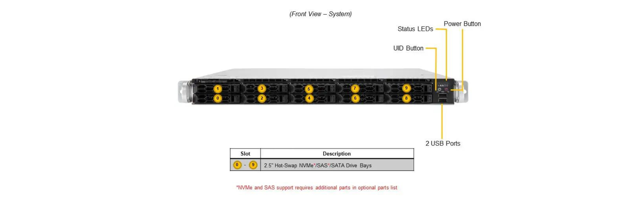- 10x 2.5″ hot-swap hybrid NVMe/SATA/SAS drive bays